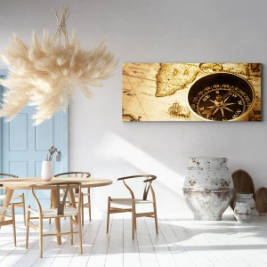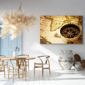 Quadro su tela - Stampe su Tela - Una bussola antica sullo sfondo di una vecchia mappa del mondo - 50x70cm - A est o a ovest? - Decorazione murale moderna per soggiorno e camera da letto ARTTOR