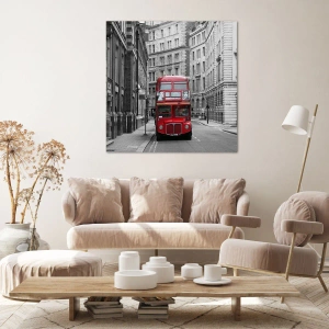 Quadro su tela - Stampe su Tela - Un autobus rosso sullo sfondo di edifici cittadini bianchi e neri. - 70x100cm - Il quotidiano non deve essere grigio - Decorazione murale moderna per soggiorno e camera da letto ARTTOR