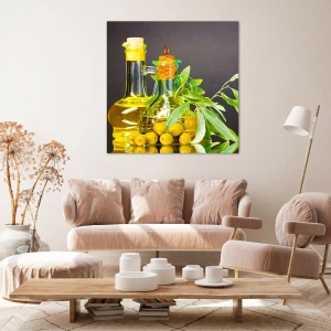 Quadro su tela - Stampe su Tela - Bottiglie di olio d'oliva e rami di ulivo - 50x70cm - Natura morta con olive e olio - Decorazione murale moderna per soggiorno e camera da letto ARTTOR