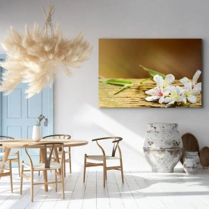 Quadro su tela - Stampe su Tela - Fiori bianchi su uno sfondo di legno alla luce naturale - 50x70cm - Promessa innocente - Decorazione murale moderna per soggiorno e camera da letto ARTTOR