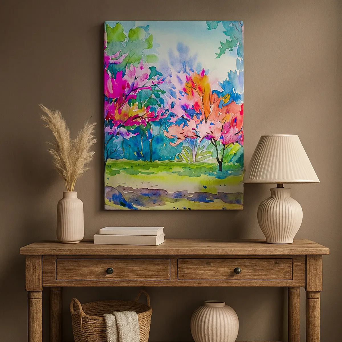 Quadro su tela - Stampe su Tela - Alberi colorati in un parco in stile acquerello - 50x70cm - Giardino multicolore nella luce della primavera - Decorazione murale moderna per soggiorno e camera da letto ARTTOR