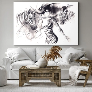 Quadro su tela - Stampe su Tela - Una donna in una danza dinamica con zebre in un'estetica in bianco e nero - 70x100cm - Ballando con le zebre - Decorazione murale moderna per soggiorno e camera da letto ARTTOR