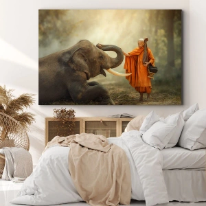 Quadro su tela - Stampe su Tela - Un monaco e un elefante in armonia sullo sfondo della natura - 50x70cm - Incontro nel viaggio - Decorazione murale moderna per soggiorno e camera da letto ARTTOR