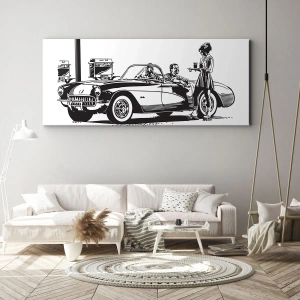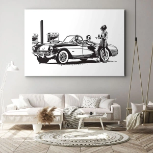 Quadro su tela - Stampe su Tela - Una scena retrò in bianco e nero con un'auto e una cameriera sui pattini a rotelle. - 70x100cm - Anni '60: l'America spensierata - Decorazione murale moderna per soggiorno e camera da letto ARTTOR