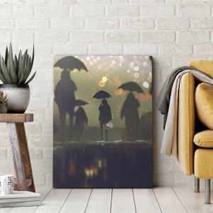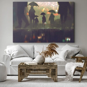 Quadro su tela - Stampe su Tela - Una figura con un ombrello in una sera piovosa tra le luci della città - 70x100cm - Dalla prospettiva di una goccia di pioggia - Decorazione murale moderna per soggiorno e camera da letto ARTTOR