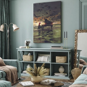 Quadro su tela - Stampe su Tela - Un pianoforte in riva al mare al tramonto con gli uccelli - 80x120cm - Concerto per pianoforte e onde - Decorazione murale moderna per soggiorno e camera da letto ARTTOR