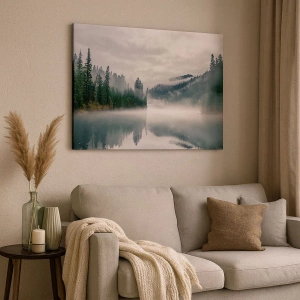 Quadro su tela - Stampe su Tela - Una foresta nebbiosa riflessa in un lago calmo - 70x100cm - Riflettendo nella nebbia - Decorazione murale moderna per soggiorno e camera da letto ARTTOR