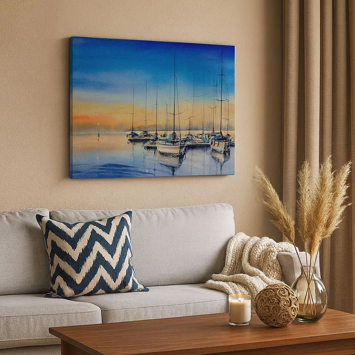 - Un dipinto raffigurante un porto turistico al tramonto, con yacht riflessi nell'acqua calma. Una decorazione pittoresca che infonde armonia e tranquillità.