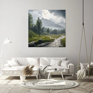 Quadro su tela - Stampe su Tela - Un paesaggio montano con un fiume e alberi circondati da montagne nebbiose - 80x120cm - Andata e ritorno - Decorazione murale moderna per soggiorno e camera da letto ARTTOR