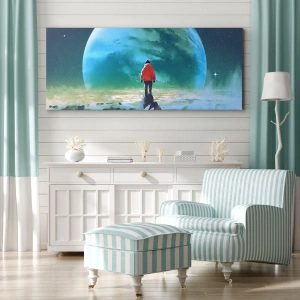 Quadro su tela - Stampe su Tela - Un uomo con una giacca rossa in piedi davanti a un grande pianeta con le stelle sullo sfondo. - 160x50cm - Scopritore di una nuova terra - Decorazione murale moderna per soggiorno e camera da letto ARTTOR