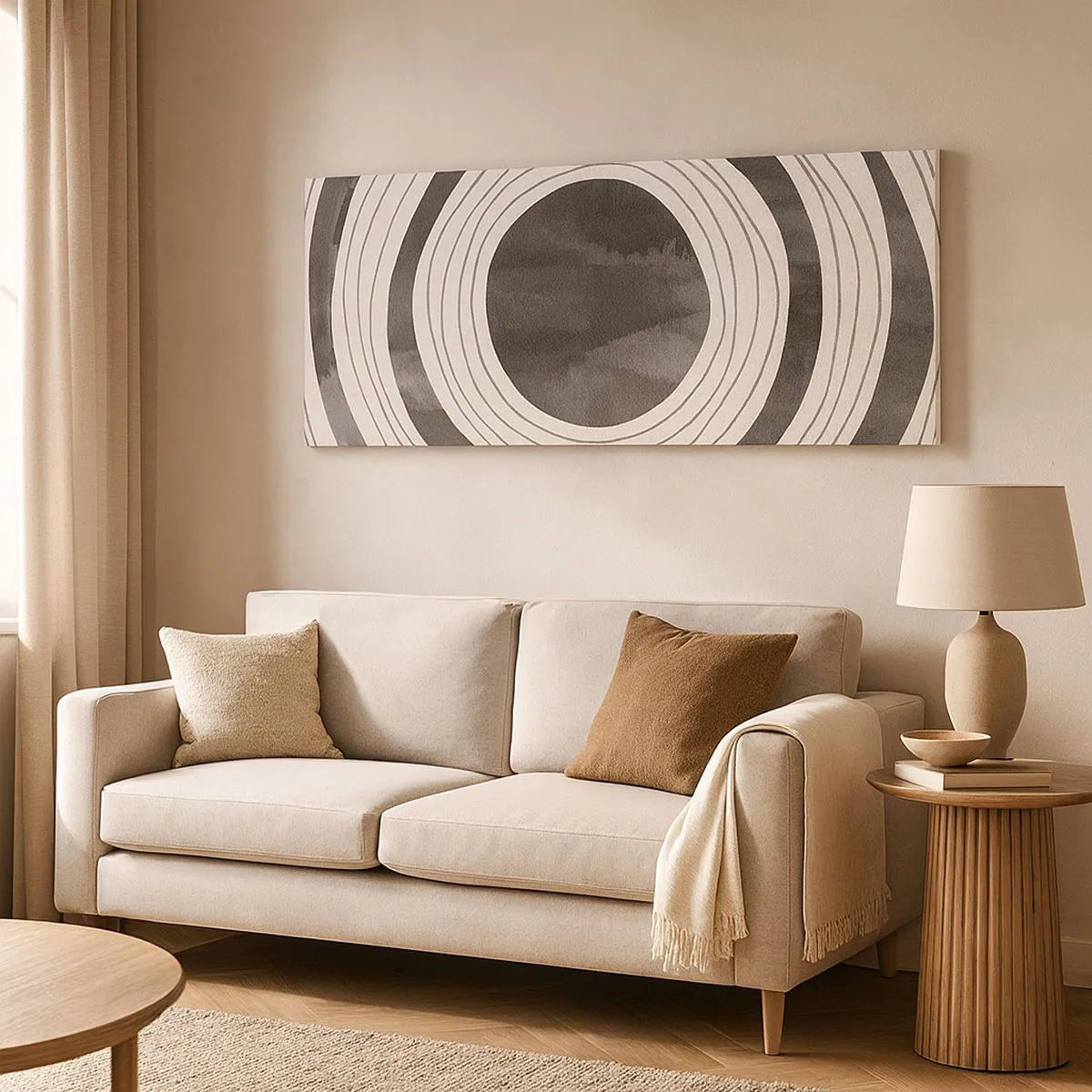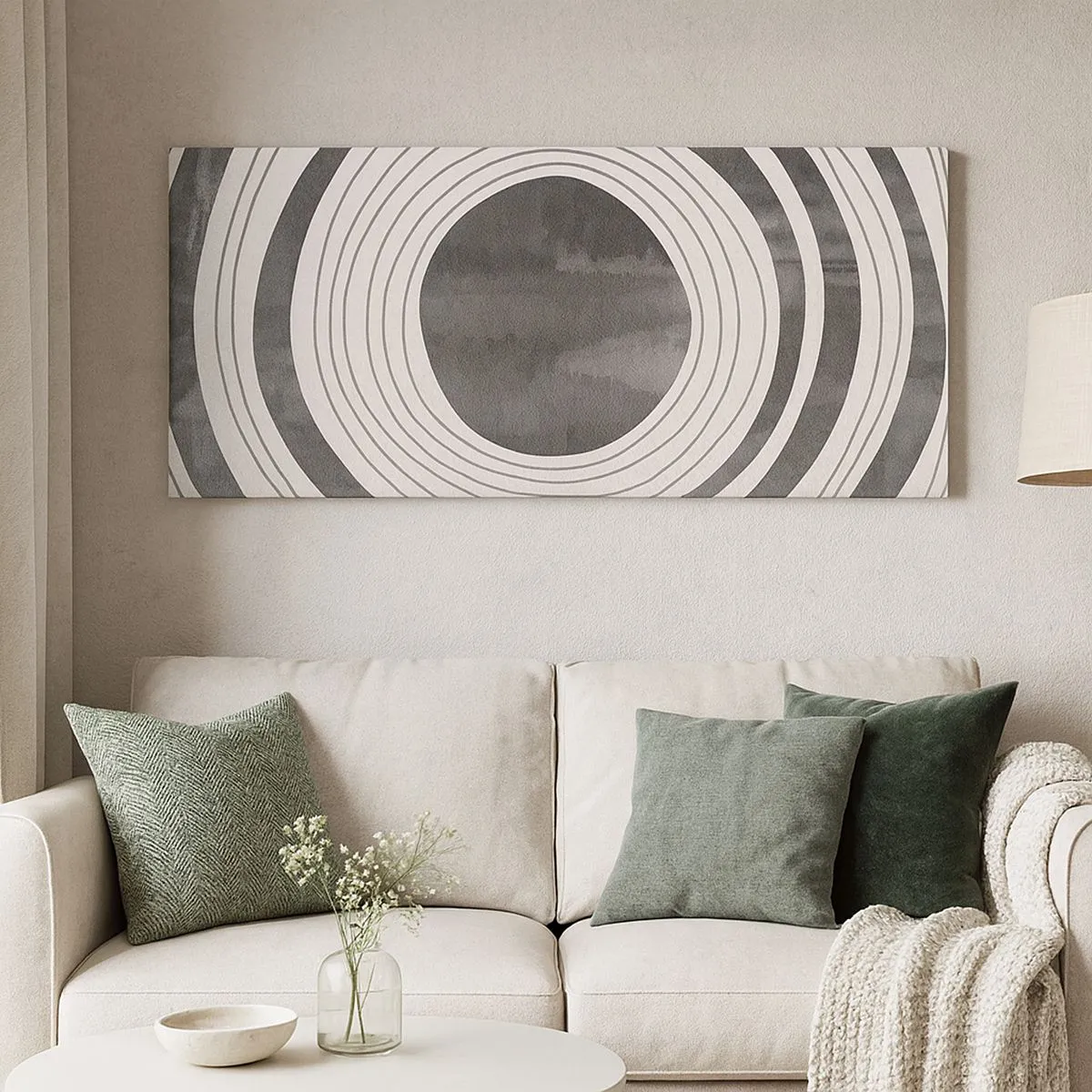 Quadro su tela - Stampe su Tela - Cerchi concentrici bianchi e neri su sfondo chiaro - 160x50cm - Proprio al centro - Decorazione murale moderna per soggiorno e camera da letto ARTTOR