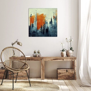 - Il dipinto raffigura un paesaggio urbano astratto nei toni dell'arancione e del blu. La composizione dinamica si adatta perfettamente agli interni moderni.