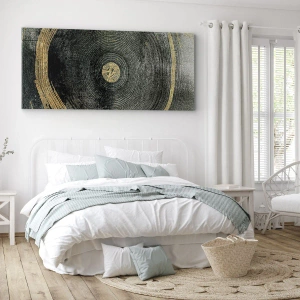 - Cerchi concentrici con delicati accenti dorati su uno sfondo scuro creano una composizione artistica unica. Il dipinto si adatta perfettamente ad interni moderni ed eleganti, come soggiorni o camere da letto, conferendo loro un carattere sofisticato.
