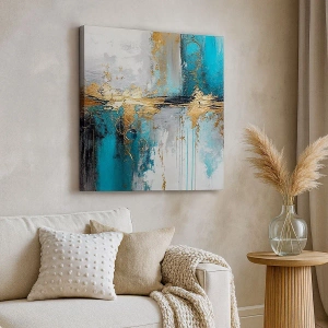 - Questa stampa su tela 70x50 cm raffigura una composizione astratta nei toni del turchese e dell'oro. Un'aggiunta perfetta ad interni moderni ed eleganti.