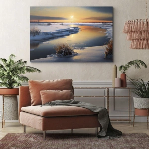 - Un paesaggio invernale con un fiume e il sole al tramonto, circondato da un paesaggio innevato. Questo dipinto cattura l'armonia della natura, perfetto per interni che cercano di evocare la tranquillità e la delicata eleganza di un ambiente invernale.