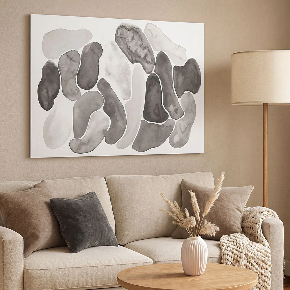 "Astrazione su pietra" è un'opera d'arte moderna che raffigura un'astrazione in bianco e nero con macchie irregolari su sfondo bianco. Questa composizione minimalista unisce semplicità ed eleganza, introducendo armonia e un'estetica raffinata negli interni. Delicate transizioni tonali e forme irregolari conferiscono all'immagine profondità ed espressività, ispirando riflessione e contemplazione.