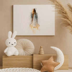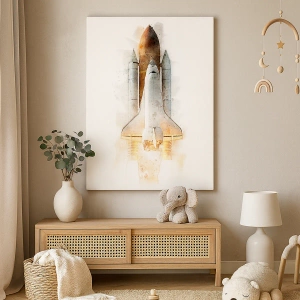 - Una stampa su tela raffigurante uno space shuttle in decollo, in un'interpretazione artistica ad acquerello. Un perfetto elemento decorativo per gli amanti dello spazio e per gli interni moderni.