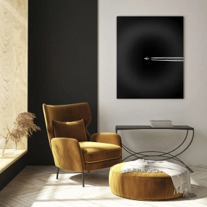- Una moderna stampa su vetro raffigurante un aereo a reazione che vola nello spazio su uno sfondo nero con una distinta scia di condensa. Una composizione minimalista, ideale per interni moderni dal carattere distintivo.