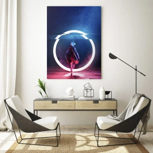 Quadro su vetro - Una figura in un ambiente futuristico con un anello al neon - 70x50cm - Tra due mondi - Decorazione murale moderna per soggiorno e camera da letto ARTTOR