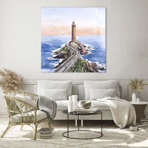 Quadro su vetro - Un faro su un promontorio roccioso circondato da un mare calmo - 50x70cm - Rivolto verso il mare - Decorazione murale moderna per soggiorno e camera da letto ARTTOR
