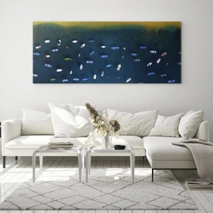 Quadro su vetro - Vista aerea di barche in acqua e di una spiaggia sabbiosa - 140x50cm - Il gioco delle vacanze - Decorazione murale moderna per soggiorno e camera da letto ARTTOR