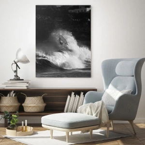 Quadro su vetro - Un surfista che cavalca un'onda immortalato in una fotografia in bianco e nero - 50x70cm - Sfida accettata! - Decorazione murale moderna per soggiorno e camera da letto ARTTOR