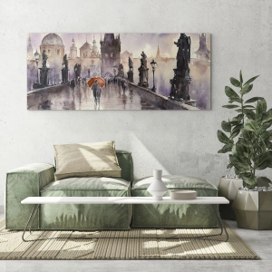 Le caratteristiche sagome degli edifici e delle statue sul ponte aggiungono monumentalità e profondità artistica, mentre i riflessi sulla superficie bagnata creano un effetto di fluidità e movimento. Il dipinto cattura perfettamente l'atmosfera della pioggia: un momento di riflessione, intimità e romanticismo. Questo dipinto per soggiorno è perfetto per arredare spazi progettati per promuovere tranquillità e atmosfera.