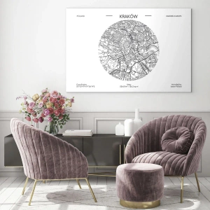 - Un'originale illustrazione in bianco e nero della mappa di Cracovia. Perfetta per interni moderni, enfatizza l'eleganza e l'atmosfera urbana. La forma geometrica dona armonia ed estetica a qualsiasi spazio.