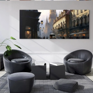 Quadro su vetro - Scena di strada serale con architettura storica - 160x50cm - Il fascino delle sere di Praga - Decorazione murale moderna per soggiorno e camera da letto ARTTOR