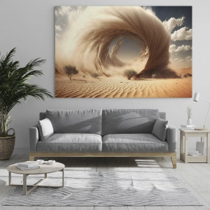 Lo sfondo è pieno di nuvole delicate e un cielo blu-beige, che contrastano con l'intenso movimento del vortice di sabbia. L'intera composizione emana pace e allo stesso tempo evoca tensione, catturando l'attenzione con il suo straordinario dinamismo. Questo motivo è perfetto per spazi che richiedono una decorazione unica e stimolante.