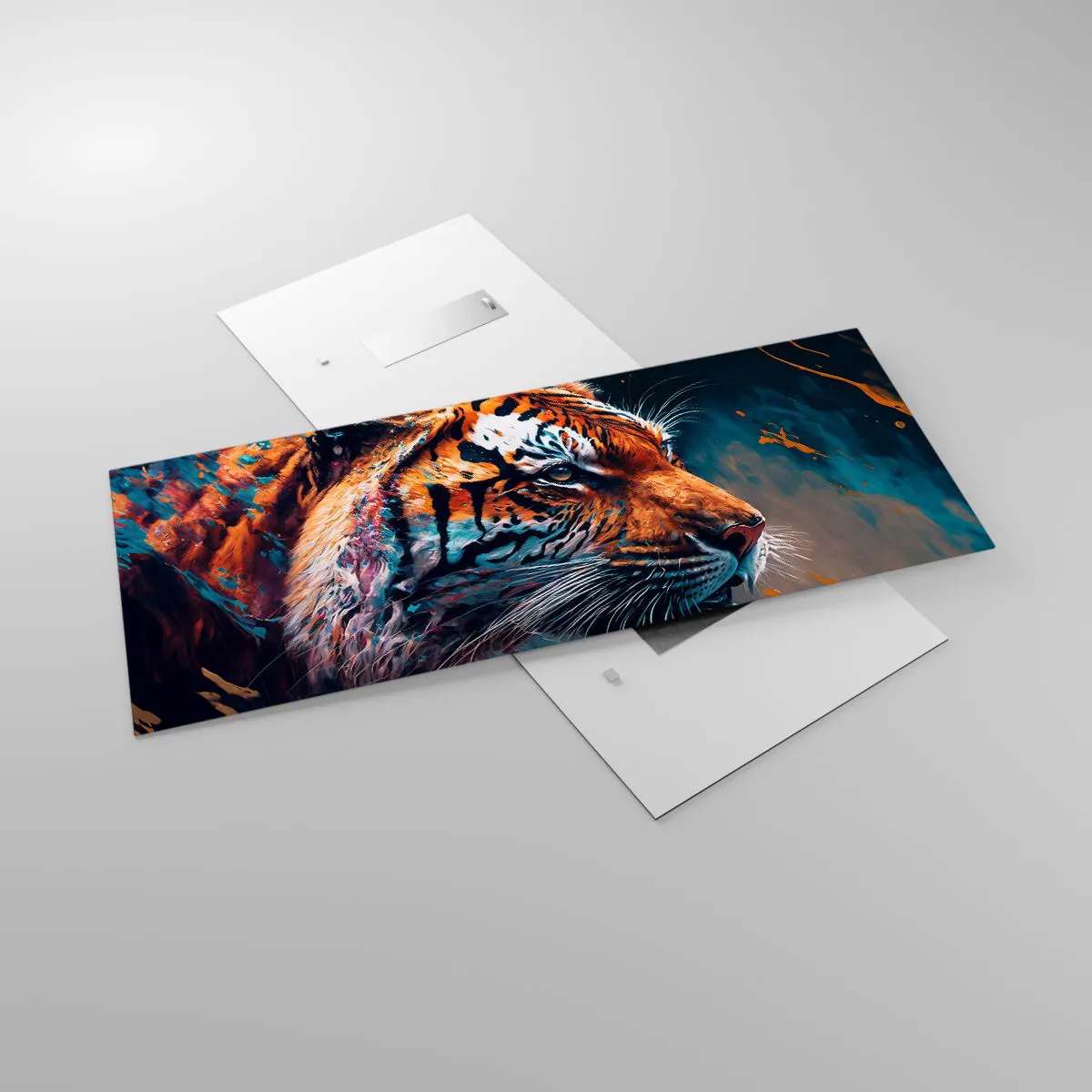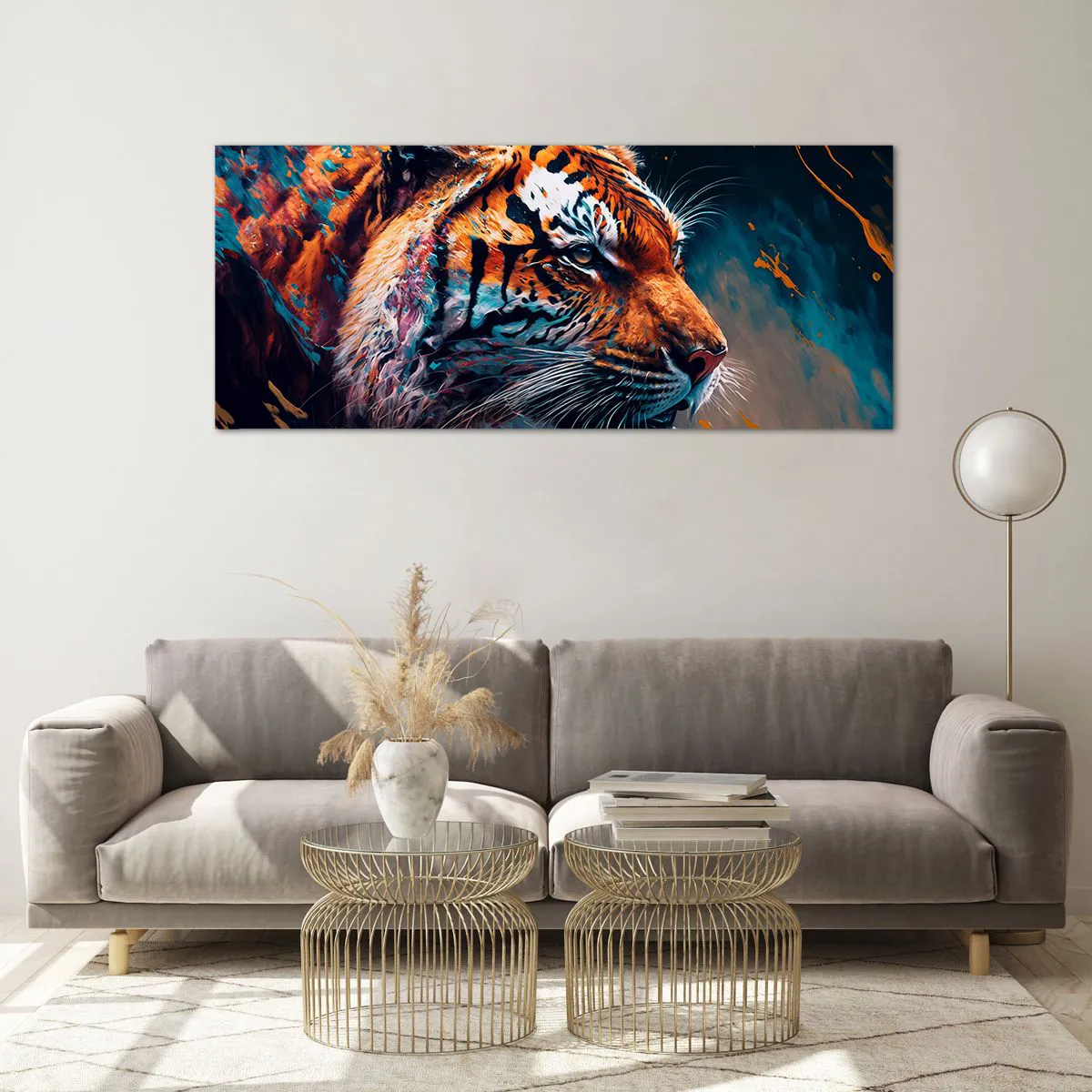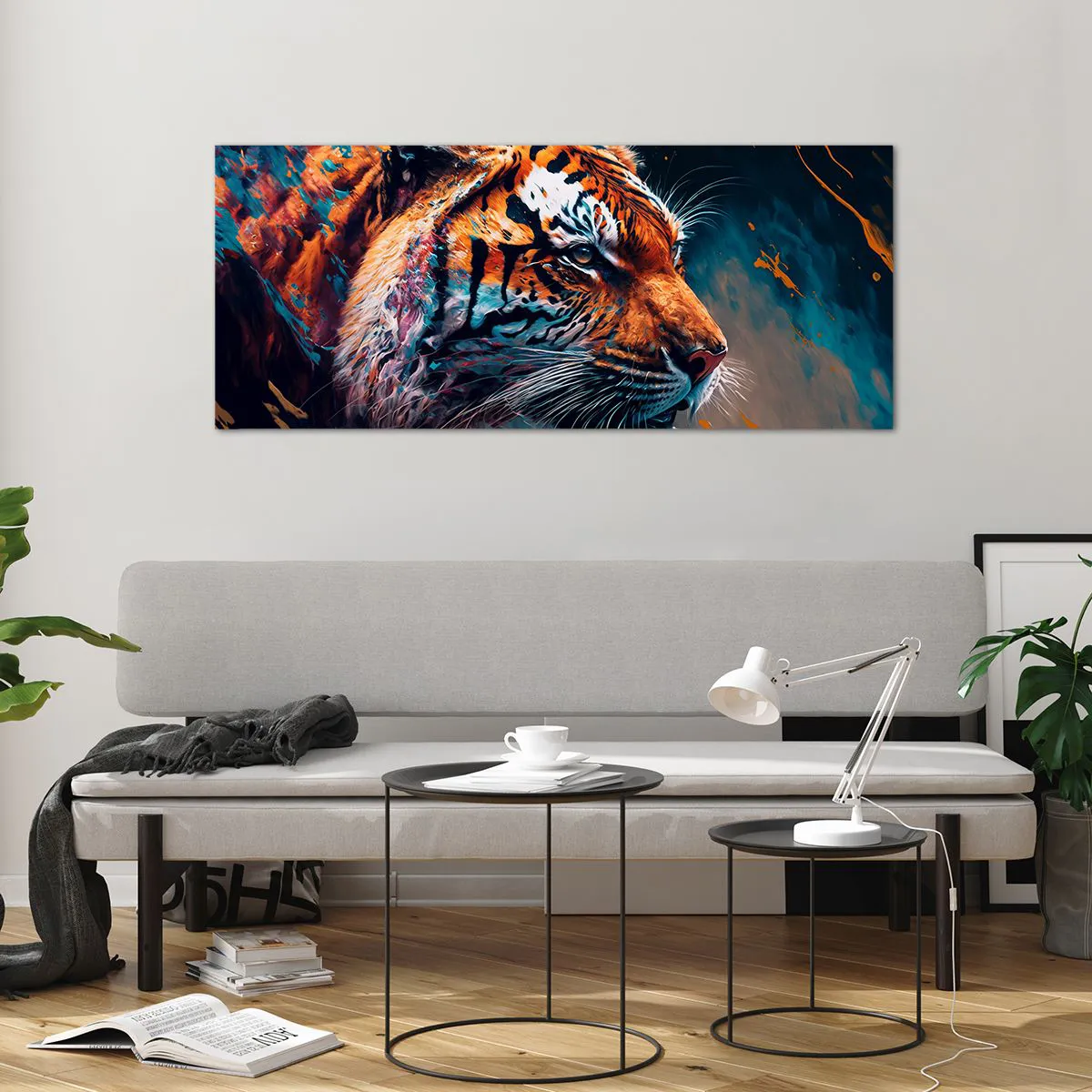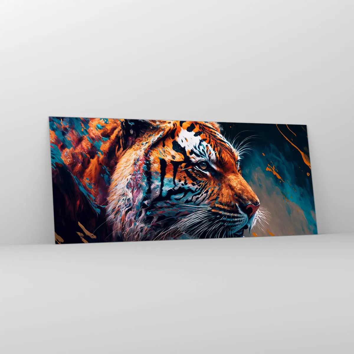Quadro su vetro - Ritratto di una tigre in colori dinamici e astratti - 120x50cm - Bellezza selvaggia - Decorazione murale moderna per soggiorno e camera da letto ARTTOR