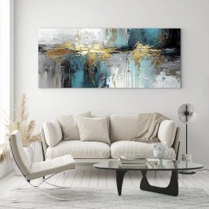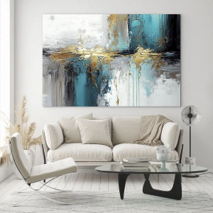 Quadro su vetro - Una composizione astratta con accenti turchesi e dorati. - 70x100cm - Panta rei - Decorazione murale moderna per soggiorno e camera da letto ARTTOR