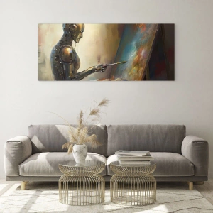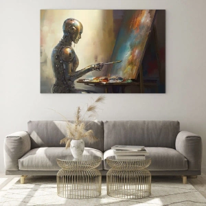 Quadro su vetro - Un robot che dipinge un quadro su un cavalletto - 70x50cm - L'arte del futuro - Decorazione murale moderna per soggiorno e camera da letto ARTTOR