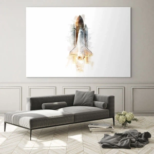 La stampa su vetro "Esploratori al decollo" è un viaggio visivo unico nello spazio. Raffigura uno space shuttle al momento del lancio, catturato in uno stile che ricorda l'acquerello. La composizione si concentra sull'oggetto centrale: un razzo, i cui motori emettono energia, luce e movimento. Lo sfondo bianco esalta l'effetto di minimalismo e spazio, creando un senso di infinito.
