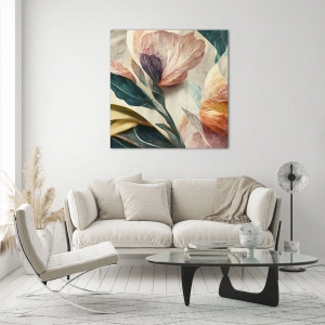Quadro su vetro - Fiori e foglie esotici in colori pastello in stile botanico - 70x50cm - I fiori delle isole del sud - Decorazione murale moderna per soggiorno e camera da letto ARTTOR