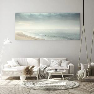 Quadro su vetro - Una figura che passeggia su una spiaggia deserta in riva al mare calmo - 50x70cm - Cercando la pace - Decorazione murale moderna per soggiorno e camera da letto ARTTOR