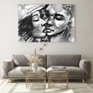 Quadro su vetro - Schizzo in bianco e nero di un tenero bacio - 70x50cm - Un attimo di tenerezza - Decorazione murale moderna per soggiorno e camera da letto ARTTOR