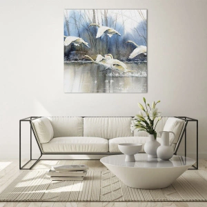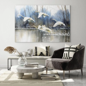Quadro su vetro - Cigni in volo sopra un lago ghiacciato in un paesaggio invernale - 120x50cm - Come la favola dei cigni selvatici - Decorazione murale moderna per soggiorno e camera da letto ARTTOR