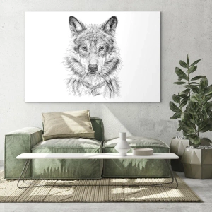 Quadro su vetro - Schizzo in bianco e nero di una testa di lupo su uno sfondo bianco - 70x50cm - Condottiero nato - Decorazione murale moderna per soggiorno e camera da letto ARTTOR