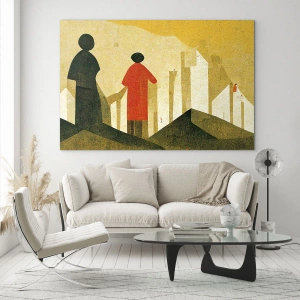 Quadro su vetro - Silhouette geometriche di figure tra forme alte sullo sfondo di un cielo giallo - 70x50cm - La strada è ancora lunga - Decorazione murale moderna per soggiorno e camera da letto ARTTOR