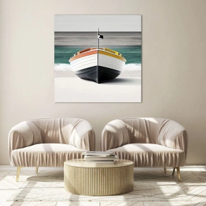Quadro su vetro - Una barca sulla spiaggia con un mare turchese sullo sfondo - 80x120cm - Al suo posto - Decorazione murale moderna per soggiorno e camera da letto ARTTOR