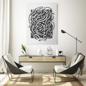 Quadro su vetro - Linee e punti astratti dinamici che creano una forma energica - 50x70cm - Astrazione: la danza della gioia - Decorazione murale moderna per soggiorno e camera da letto ARTTOR