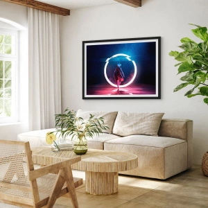 Poster in cornice nera - Un personaggio in un ambiente futuristico con un cerchio al neon - 70x50cm - Tra due mondi - Decorazione murale moderna per soggiorno e camera da letto ARTTOR