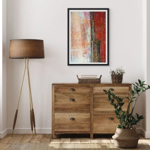 - Il poster mostra una composizione astratta nei toni del rosso e del beige, ricca di abrasioni strutturali e motivi irregolari, che conferiscono all'interno un carattere moderno e artistico.