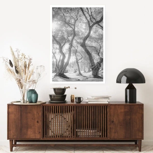 Poster - Vista in bianco e nero degli alberi in un uliveto con raggi di sole - 100x70cm - Nell'orto degli ulivi - Decorazione murale moderna per soggiorno e camera da letto ARTTOR