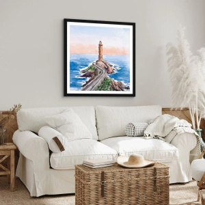 - Questo poster raffigura un faro su una costa rocciosa in un'illustrazione ad acquerello. Il delicato gioco di colori e la prospettiva dinamica esaltano il fascino del paesaggio.