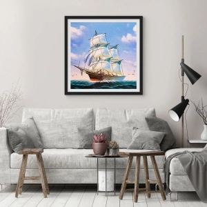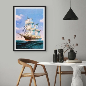 Poster in cornice nera - Una nave a vela in mare aperto sotto un cielo azzurro - 100x70cm - Con orgoglio nel vento - Decorazione murale moderna per soggiorno e camera da letto ARTTOR