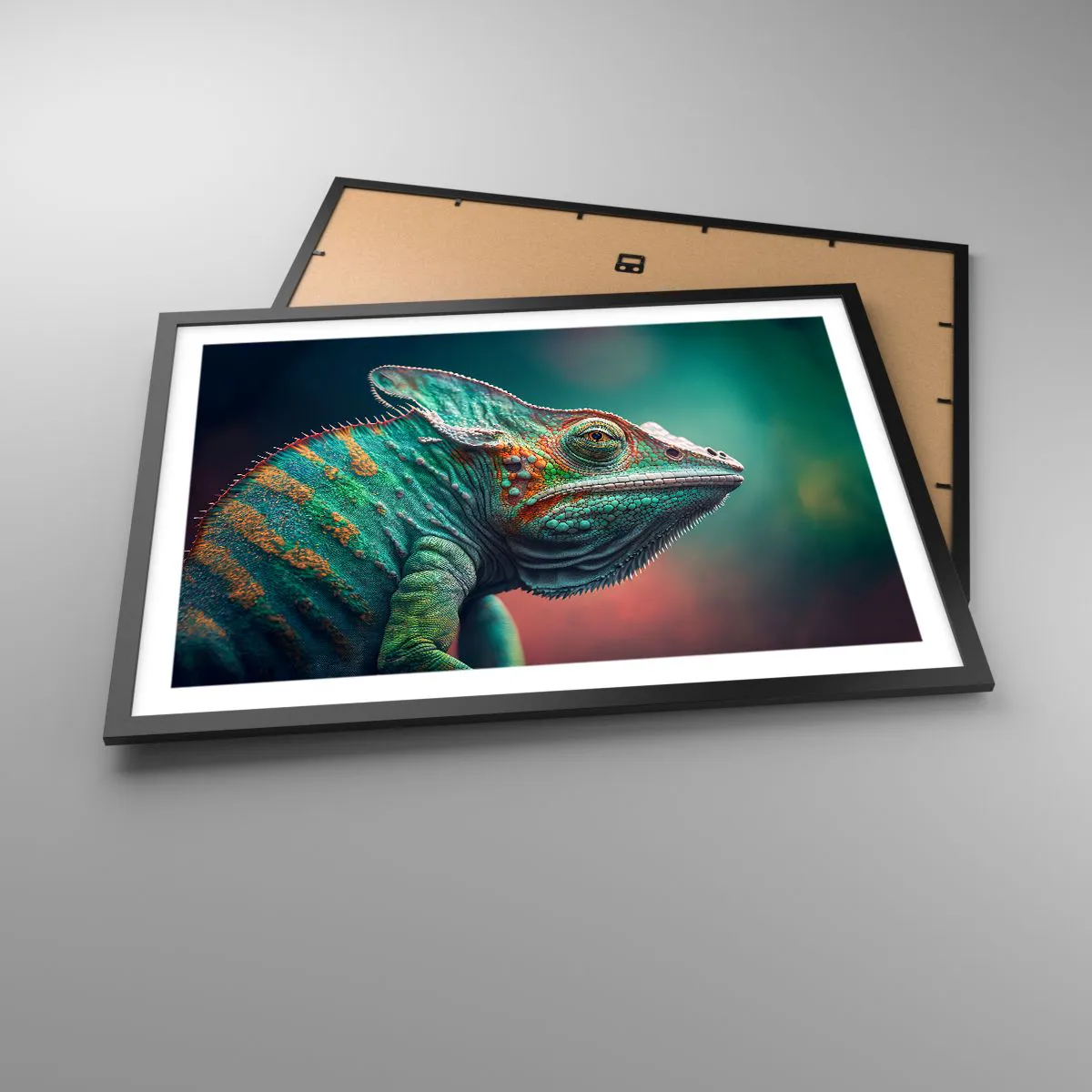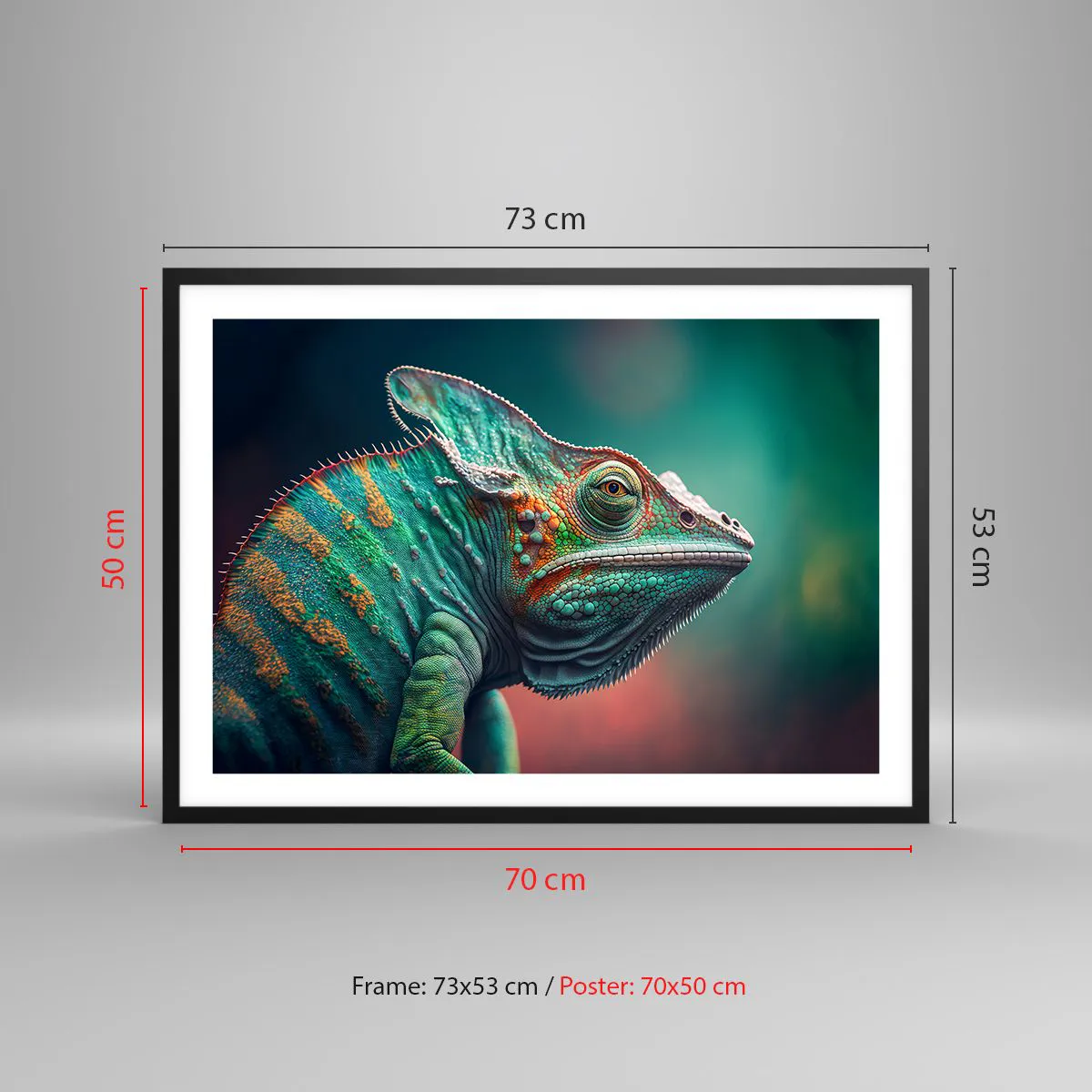 Poster in cornice nera - Primo piano di un camaleonte dai colori intensi - 70x50cm - Mi vedi? Non va bene... - Decorazione murale moderna per soggiorno e camera da letto ARTTOR