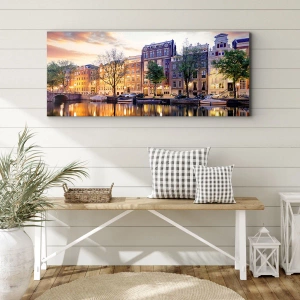 Quadro su tela - Stampe su Tela - Canale con il riflesso delle case popolari nella luce della sera - 140x50cm - Bellezza olandese riservata e tranquilla - Decorazione murale moderna per soggiorno e camera da letto ARTTOR