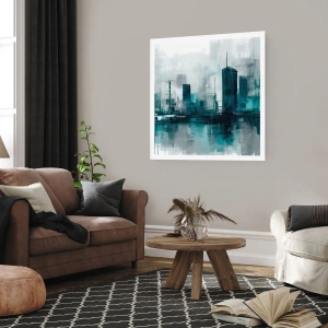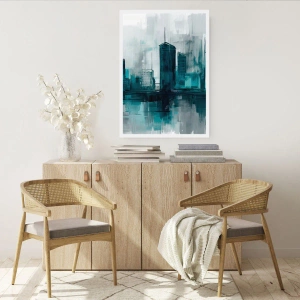 Poster - Una città moderna nei toni del turchese e del grigio - 100x70cm - La città al colore della pioggia - Decorazione murale moderna per soggiorno e camera da letto ARTTOR
